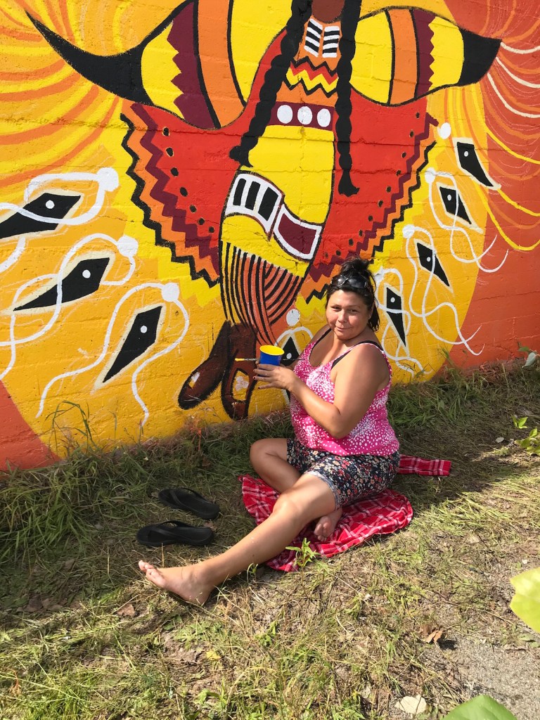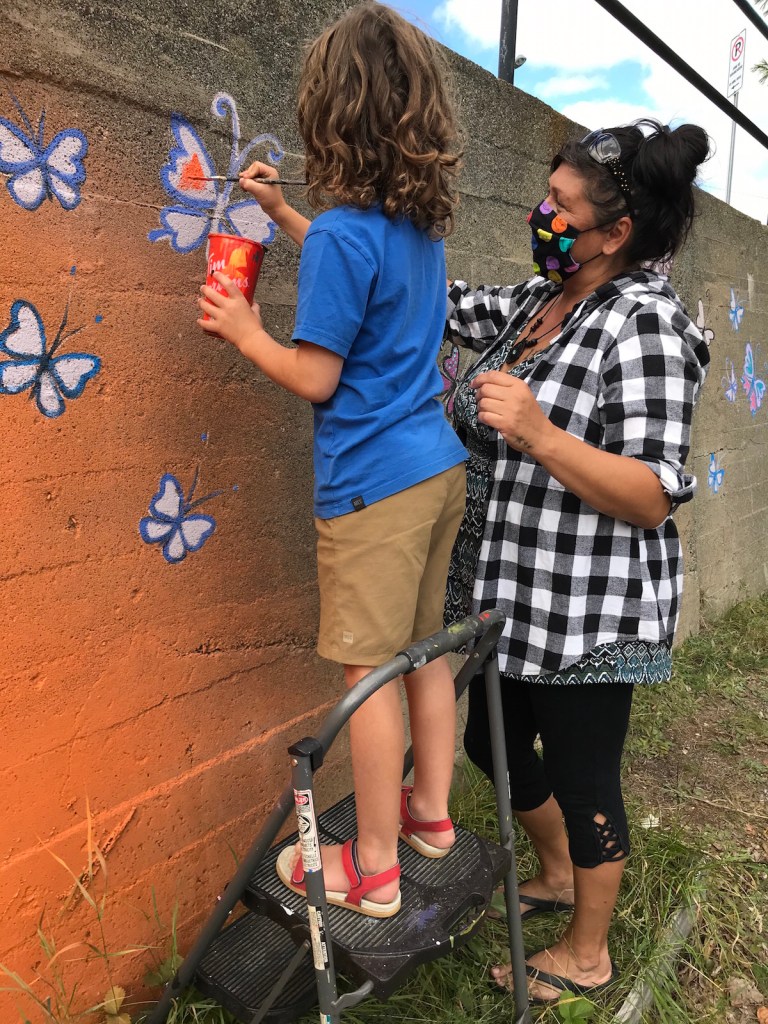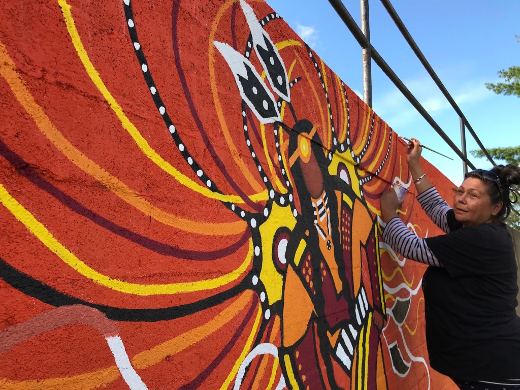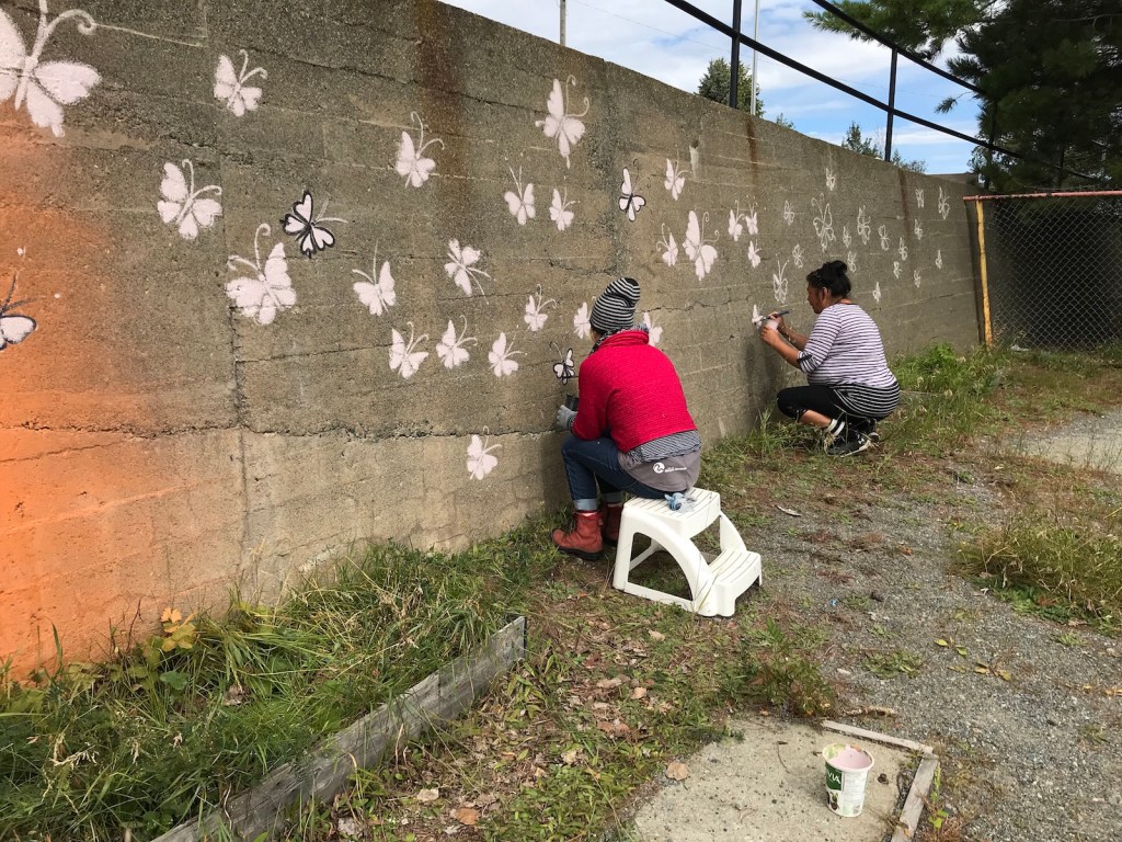 « Chasser les murs », murale de Claudette Happyjack, École Papillon d’or, Val-d’Or, août 2020.