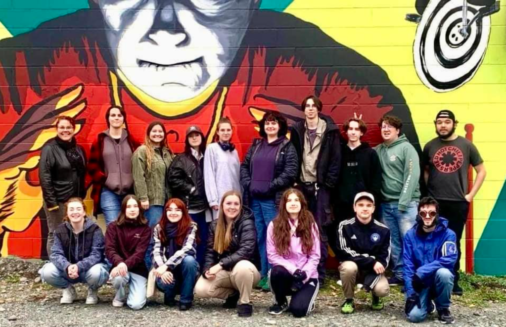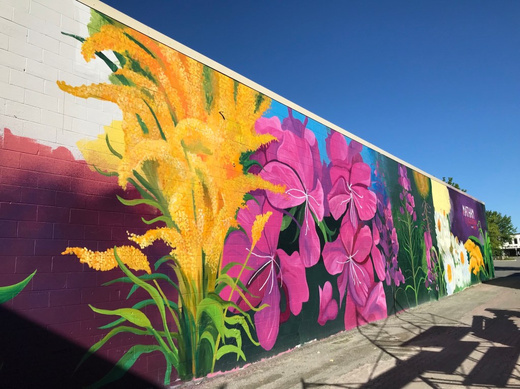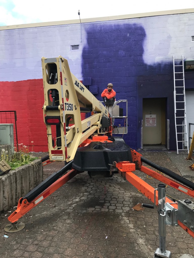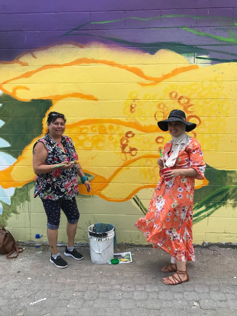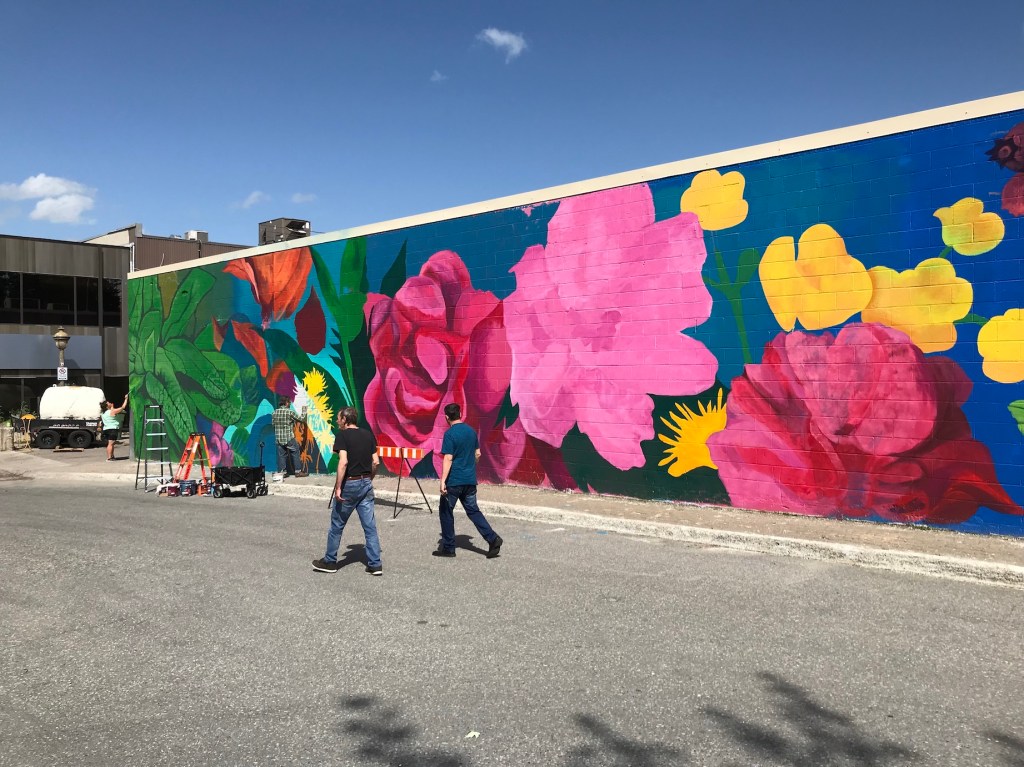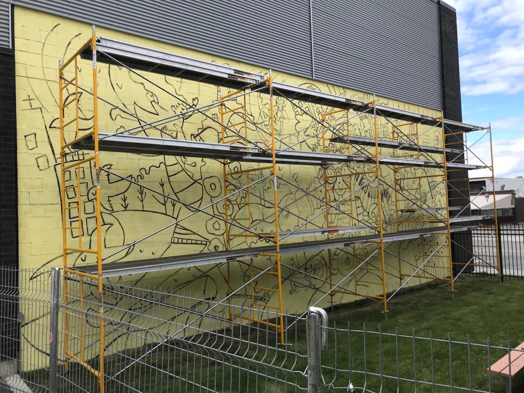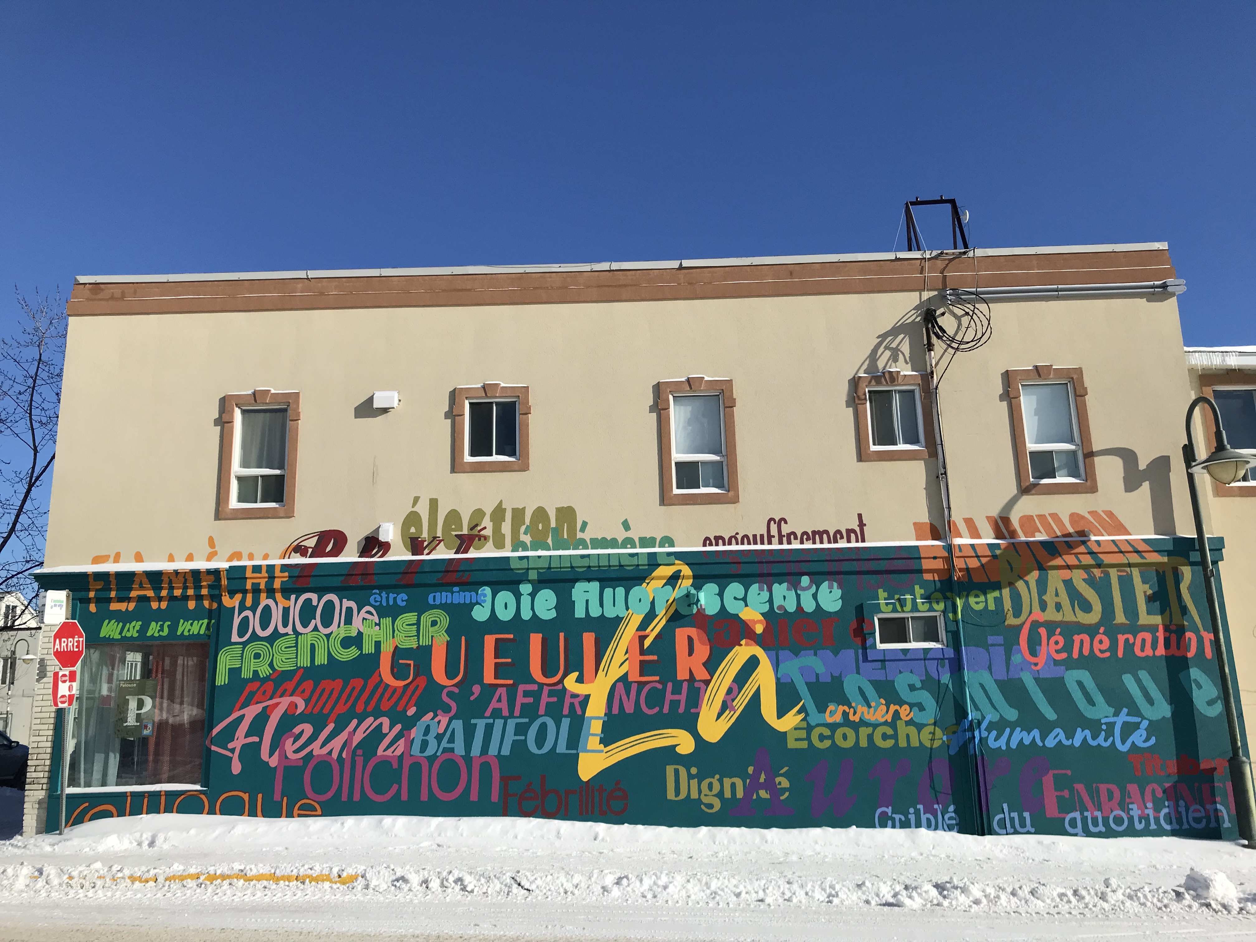 Murale réalisée avec les étudiant.e.s du cours Création actuelle en peinture 1 du DEC en arts visuels du Cégep de l’Abitibi-Témiscamingue, sur le mur du bar-librairie Livresse, 9e rue, Rouyn-Noranda.