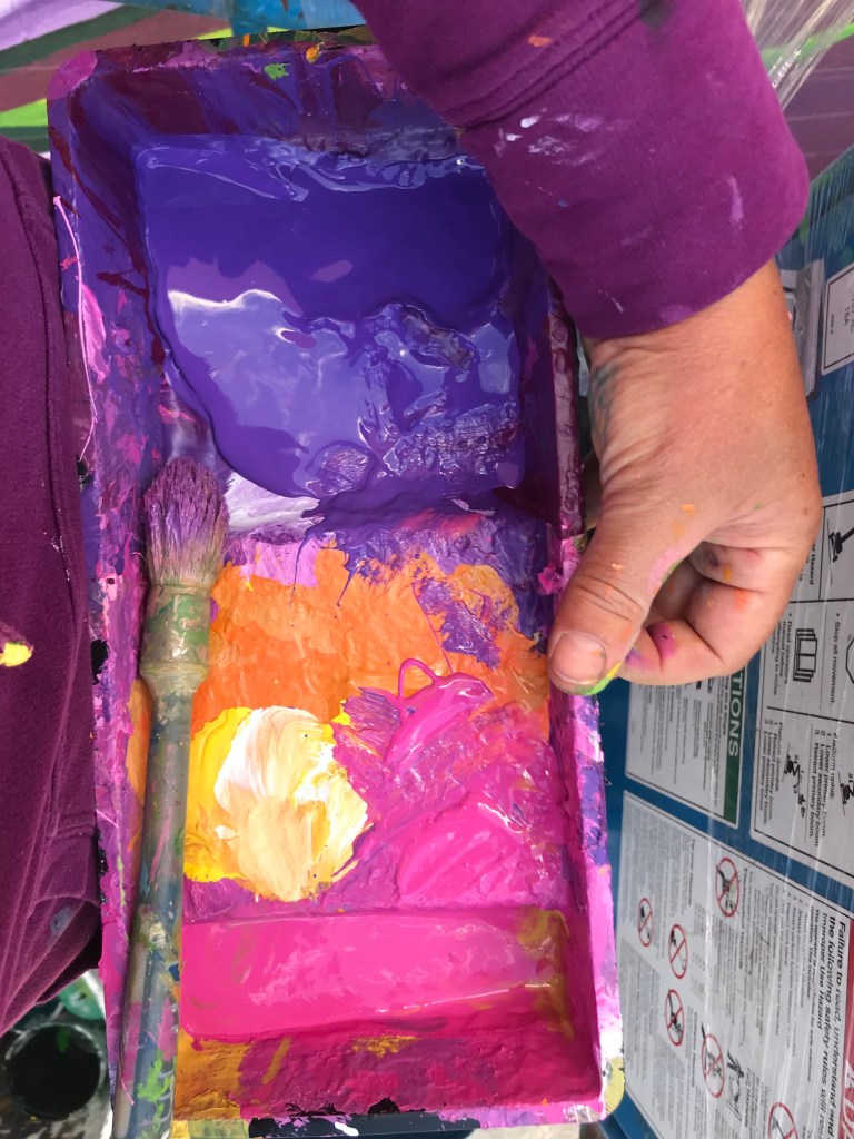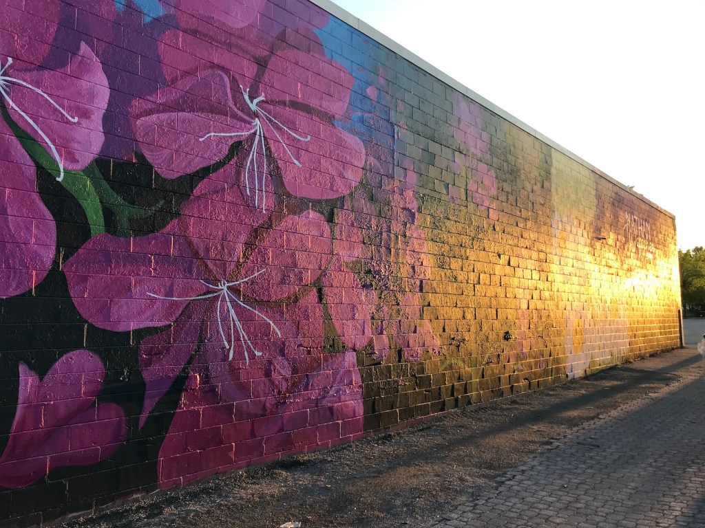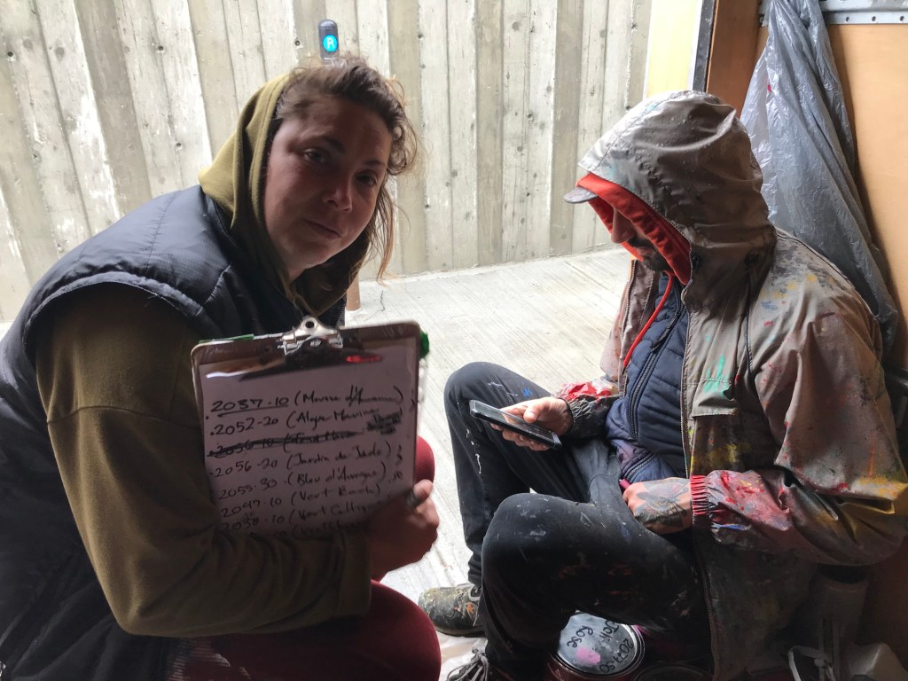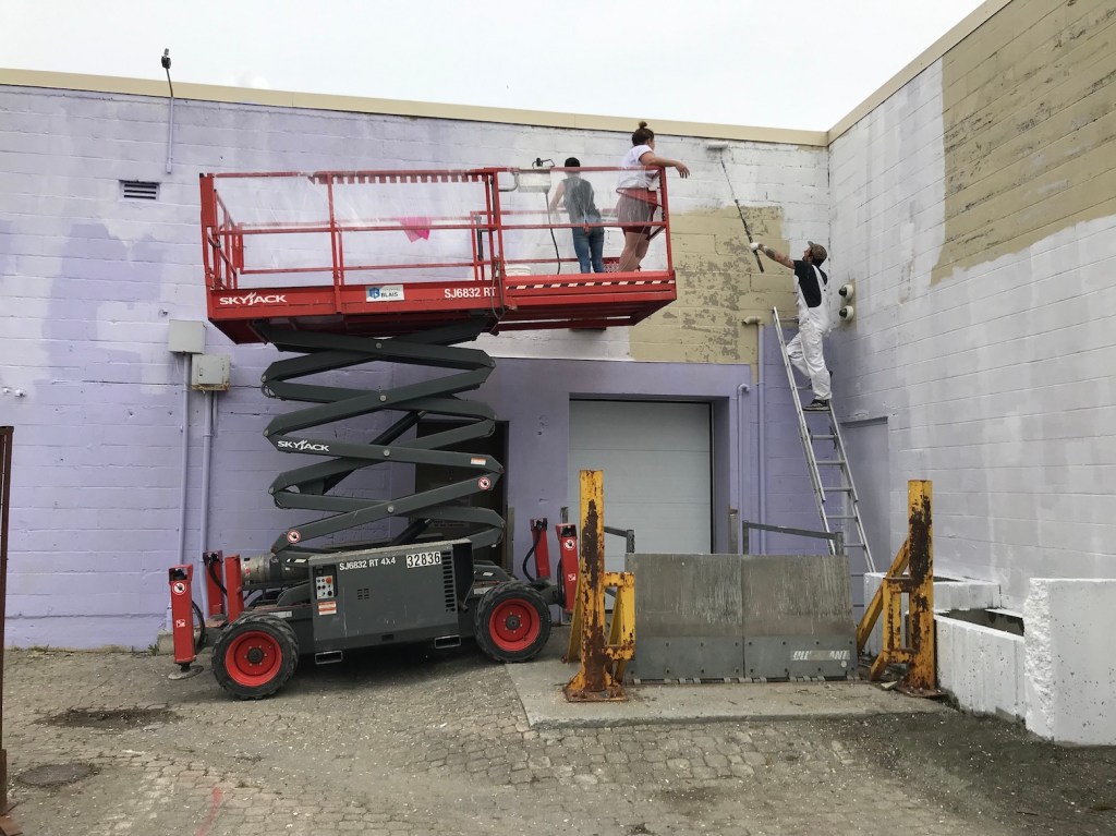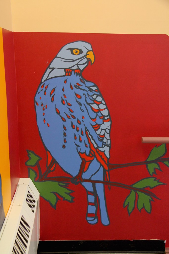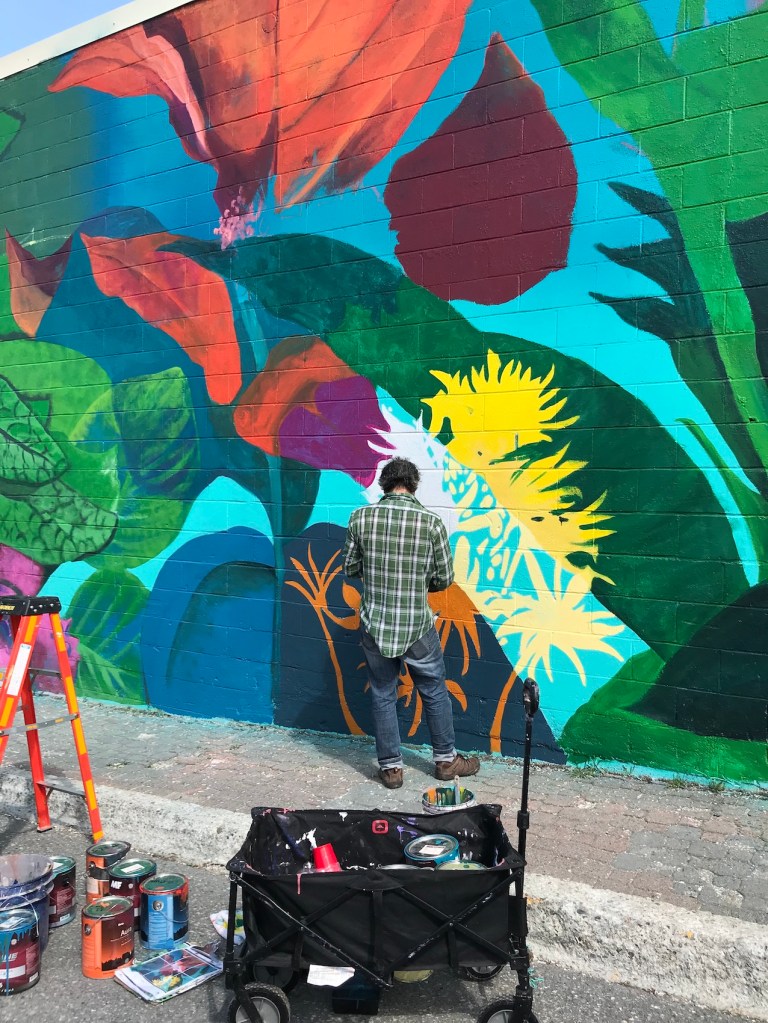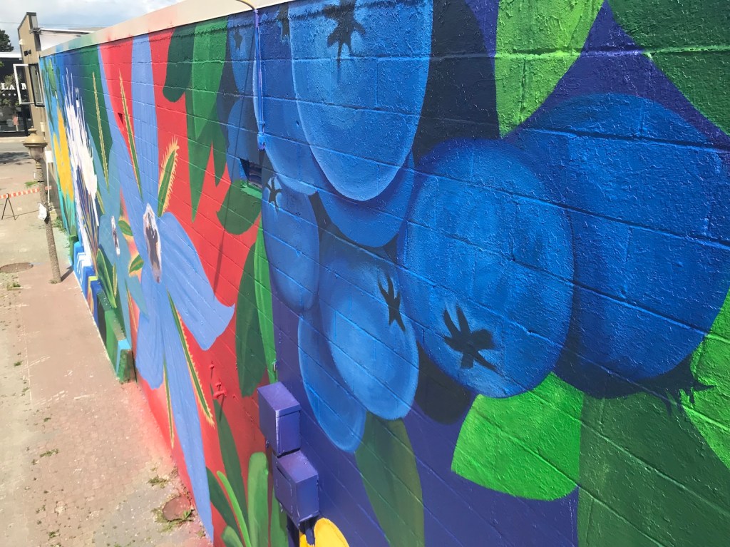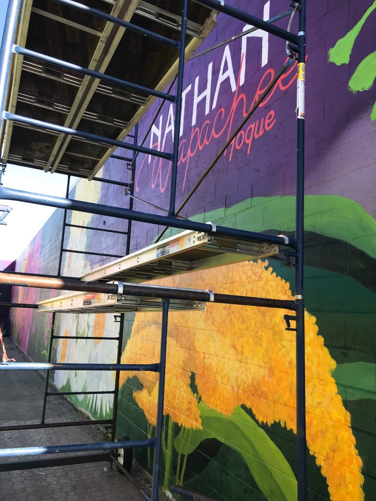 Murale réalisée avec les étudiant.e.s du cours Création actuelle en peinture 1 du DEC en arts visuels du Cégep de l’Abitibi-Témiscamingue, sur le mur du bar-librairie Livresse, 9e rue, Rouyn-Noranda.
